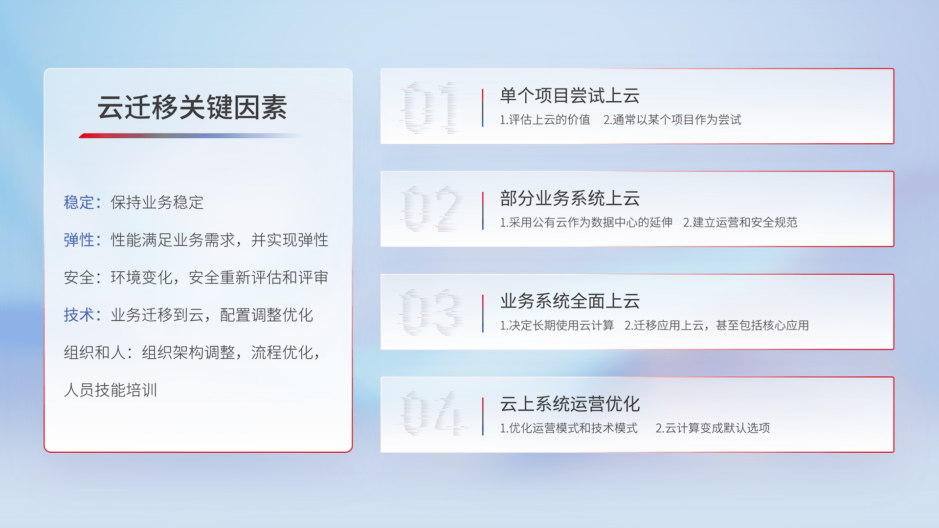 结合实际业务,,从规划设计、、、、云平台选型、、、云原生改造、、数据迁移、、、集成交付,,,,迁移全过程为客户识别最佳上云路径,,做好风险识别管理,,,,设计网络架构、、身份权限、、、安全审计合规、、、、操作审计、、、日志审计、、、、监控告警策略、、、、多站点容灾设计等,,,,对云上基础设施进行整体规划,,,提升IT治理水平,,,,以满足弹性、、、、高可用、、、高性能的需求。。