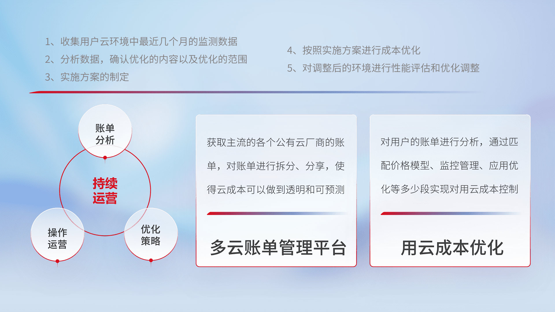 通过多云纳管,,,,以统一的资源数据模型把客户的云资源进行抽象和封装,,,,进而实现对多云资源的统一操作,,,保障云资源管理的可靠性、、、、稳定性与可用性。。。量身定制化运维内容,,,配置、、开发运维、、、补丁管理、、、备份、、、监控、、、认证和访问管理、、、、审计和日常巡检等,,,保障在用云过程中的可靠度,,,稳定度以及高可用率。。。