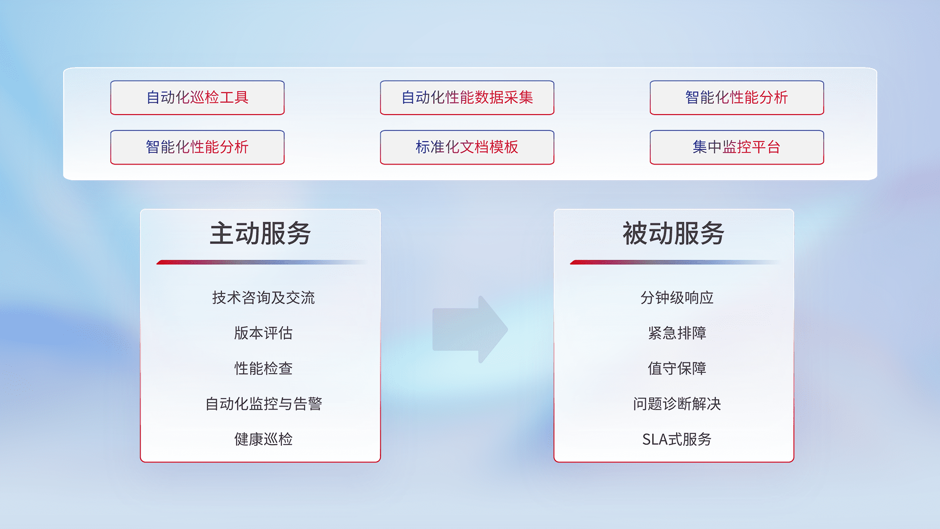 智能化工具和标准化文档,,,,保障服务质量,,提供主动服务(包含技术咨询、、、版本评估、、、、性能检查、、、自动化监控与告警、、、、健康巡检)和被动服务包含(分钟级响应、、、紧急排障、、、、值守保障、、问题诊断解决、、、、SLA服务)。。。。